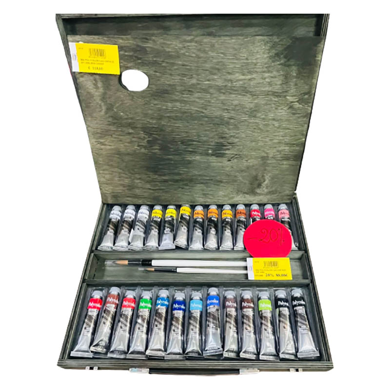 marca Maimeri, confezione con 20 tubi acrilico polycolor da 20 ml. + accessori, in cassetta vintage, scontato del -20%.